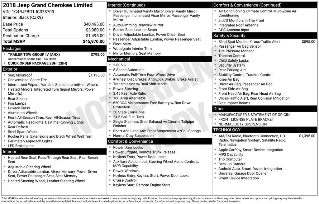 1-Year SiriusXM Guardian Trial, 3.45 Rear Axle Ratio, 4-Wheel Disc Brakes, 5-Year SiriusXM Traffic Service, 5-Year SiriusXM Travel Link Service, 6 Speakers, 7 & 4 Pin Wiring Harness, 8.4 Touchscreen Display, ABS brakes, Air Conditioning, Alloy wheels, AM/FM radio: SiriusXM, Anti-whiplash front head restraints, Apple CarPlay, Apple CarPlay/Android Auto, Audio memory, Auto-dimming door mirrors, Auto-Dimming Exterior Passenger Mirror, Auto-dimming Rear-View mirror, Automatic temperature control, Blind Spot & Cross Path Detection, Brake assist, Bumpers: body-color, Chrome Exterior Mirrors, Class IV Receiver Hitch, Compass, Delay-off headlights, Driver door bin, Driver vanity mirror, Dual front impact airbags, Dual front side impact airbags, Electronic Stability Control, Engine Oil Cooler, For Details Visit DriveUconnect.com, Four wheel independent suspension, Front anti-roll bar, Front Bucket Seats, Front Center Armrest w/Storage, Front dual zone A/C, Front fog lights, Front License Plate Bracket, Front reading lights, Fully automatic headlights, Garage door transmitter, Google Android Auto, GPS Antenna Input, GPS Navigation, HD Radio, Heated door mirrors, Heated front seats, Heated rear seats, Heated steering wheel, Heavy-Duty Engine Cooling, Illuminated entry, Integrated Voice Command w/Bluetooth®, Knee airbag, Leather Shift Knob, Leather Trimmed Bucket Seats, Low tire pressure warning, Manufacturer's Statement of Origin, Memory seat, Normal Duty Suspension, Occupant sensing airbag, Outside temperature display, Overhead airbag, Overhead console, Panic alarm, ParkView Rear Back-Up Camera, Passenger door bin, Passenger vanity mirror, Power door mirrors, Power driver seat, Power Liftgate, Power passenger seat, Power steering, Power Sunroof (DISC), Power windows, Quick Order Package 2BH, Radio data system, Radio: Uconnect 4 w/7 Display, Radio: Uconnect 4C Nav w/8.4 Display, Rear anti-roll bar, Rear Load Leveling Suspension, Rear reading lights, Rear seat center armrest, Rear window defroster, Rear window wiper, Remote keyless entry, Roof rack: rails only, Security system, SiriusXM Traffic Plus, SiriusXM Travel Link, Speed control, Speed-Sensitive Wipers, Split folding rear seat, Spoiler, Steering wheel mounted audio controls, Tachometer, Telescoping steering wheel, Tilt steering wheel, Traction control, Trailer Tow Group IV, Trip computer, Turn signal indicator mirrors, USB Host Flip, Variably intermittent wipers, Wheels: 18 x 8.0 Tech Gray Aluminum.**OUR PRE-OWNED VEHICLES ARE FULLY RECONDITIONED. CALL TO SEE WHAT WORK WAS DONE TO THIS VEHICLE** *PROUDLY SERVING THE BRAINERD, GRAND RAPIDS, DULUTH AND SURROUND AREAS!*