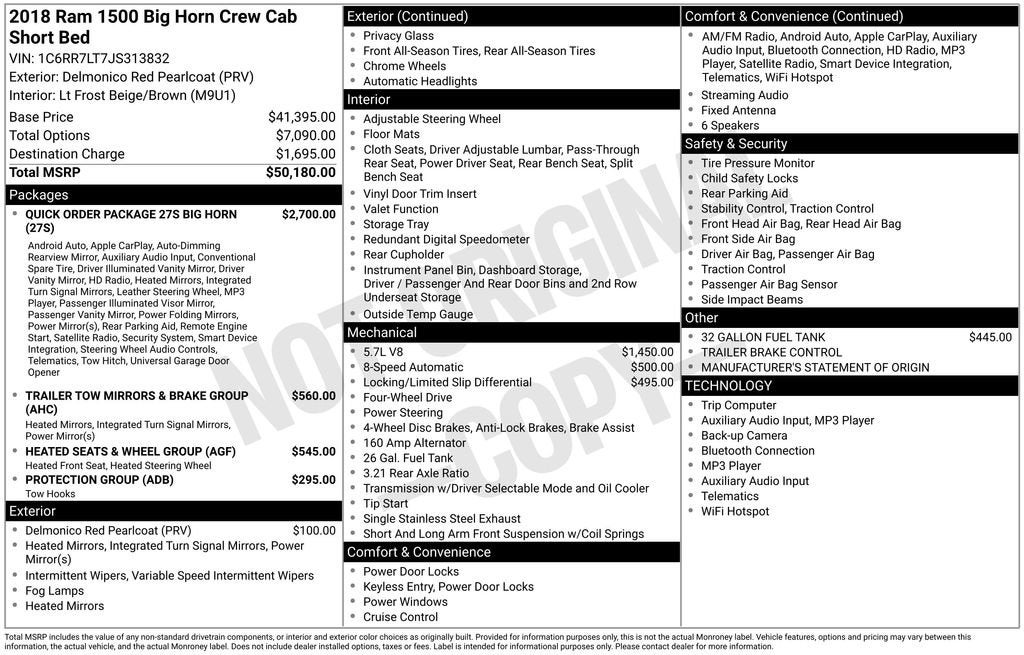 1-Yr SiriusXM Guardian Trial, 115V Auxiliary Power Outlet, 3.21 Rear Axle Ratio, 32 Gallon Fuel Tank, 4-Wheel Disc Brakes, 40/20/40 Split Bench Seat, 6 Speakers, 8.4 Touchscreen Display, ABS brakes, Active Grille Shutters, Air Conditioning, Alloy wheels, AM/FM radio: SiriusXM, Anti-Spin Differential Rear Axle, Apple CarPlay, Audio Jack Input for Mobile Devices, Auto-Dimming Exterior Mirrors, Auto-Dimming Rear-View Mirror, Big Horn Badge, Big Horn Regional Package, Black Exterior Mirrors, Brake assist, Bright/Bright Billets Grille, Bumpers: chrome, Center Hub, Charge Only Remote USB Port, Class IV Receiver Hitch (DISC), Compass, Delay-off headlights, Driver door bin, Dual front impact airbags, Dual front side impact airbags, Dual Rear Exhaust w/Bright Tips, Electric Shift-On-Demand Transfer Case, Electroluminescent Instrument Cluster, Electronic Shift, Electronic Stability Control, Exterior Mirrors Courtesy Lamps, Exterior Mirrors w/Heating Element, Exterior Mirrors w/Supplemental Signals, Folding Flat Load Floor Storage, Front anti-roll bar, Front Armrest w/3 Cupholders, Front Center Armrest w/Storage, Front Center Seat Cushion Storage, Front Fog Lamps, Front reading lights, Front wheel independent suspension, Fully automatic headlights, Glove Box Lamp, Google Android Auto, GPS Antenna Input, HD Radio, Heated door mirrors, Heated Front Seats, Heated Seats & Wheel Group, Heated Steering Wheel, Humidity Sensor, Illuminated entry, Integrated Voice Command w/Bluetooth®, Leather Wrapped Steering Wheel, LED Bed Lighting, Low tire pressure warning, Manufacturer's Statement of Origin, Media Hub (2 USB, AUX), Occupant sensing airbag, Outside temperature display, Overhead airbag, Overhead console, Overhead Console w/Garage Door Opener, Panic alarm, ParkSense Front/Rear Park Assist System, ParkView Rear Back-Up Camera, Passenger door bin, Passenger vanity mirror, Power 10-Way Driver Seat, Power Black Trailer Tow Mirrors, Power door mirrors, Power Heated Fold-Away Mirrors, Power Lumbar Adjust, Power steering, Power windows, Power-Folding Mirrors, Premium Cloth 40/20/40 Bench Seat, Protection Group, Quick Order Package 27S Big Horn, Radio data system, Radio: Uconnect 4C w/8.4 Display, Rear 60/40 Split Folding Seat, Rear anti-roll bar, Rear Dome w/On/Off Switch Lamp, Rear Floor Mats, Rear Power Sliding Window, Rear seat center armrest, Rear step bumper, Remote keyless entry, Remote Start System, Remote USB Port, Security Alarm, SiriusXM Satellite Radio, Speed control, Steering Wheel Mounted Audio Controls, Storage Tray, Sun Visors w/Illuminated Vanity Mirrors, Tachometer, Tilt steering wheel, Tip Start, Tow Hooks, Traction control, Trailer Brake Control, Trailer Tow Mirrors, Trailer Tow Mirrors & Brake Group, Trip computer, Universal Garage Door Opener, USB Host Flip, Variably intermittent wipers, Voltmeter, Wheels: 20 x 8 Aluminum Chrome Clad.