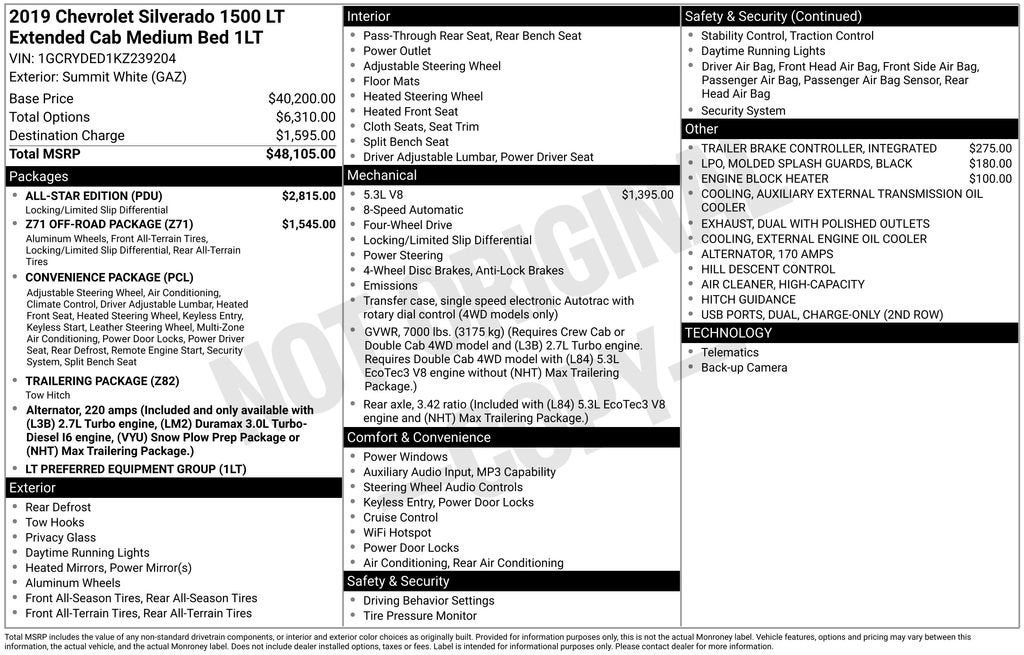 10-Way Power Driver Seat w/Lumbar, 12-Volt Rear Auxiliary Power Outlet, 170 Amp Alternator, 2 USB Ports (First Row), 220 Amps Alternator, 3.23 Rear Axle Ratio, 4-Way Manual Driver Seat Adjuster, 4-Wheel Disc Brakes, 4.2 Diagonal Color Display Driver Info Center, 40/20/40 Front Split Bench Seat, 40/20/40 Front Split-Bench Seat, 6 Speakers, ABS brakes, Air Conditioning, All-Star Edition, Alloy wheels, AM/FM radio, Apple CarPlay/Android Auto, Auxiliary External Transmission Oil Cooler, Bluetooth® For Phone, Brake assist, Bumpers: chrome, Chevrolet Connected Access, Chevrolet w/4G LTE, Chrome Grille, Chrome Mirror Caps, Cloth Seat Trim, Color-Keyed Carpeting Floor Covering, Compass, Convenience Package, Deep-Tinted Glass, Delay-off headlights, Driver door bin, Driver vanity mirror, Dual Exhaust w/Polished Outlets, Dual front impact airbags, Dual front side impact airbags, Dual-Zone Automatic Climate Control, Electric Rear-Window Defogger, Electrical Lock Control Steering Column, Electronic Cruise Control, Electronic Stability Control, Engine Block Heater, External Engine Oil Cooler, EZ Lift Power Lock & Release Tailgate, Front anti-roll bar, Front Center Armrest w/Storage, Front Frame-Mounted Black Recovery Hooks, Front License Plate Kit, Front reading lights, Front Rubberized Vinyl Floor Mats, Front wheel independent suspension, Fully automatic headlights, Heated door mirrors, Heated Driver & Front Passenger Seats, Heated Steering Wheel, Heavy Duty Suspension, Heavy-Duty Rear Locking Differential, High Capacity Air Filter (DISC), Hill Descent Control, Hitch Guidance, Illuminated entry, Integrated Trailer Brake Controller, Keyless Open & Start, Leather Wrapped Steering Wheel, LED Cargo Area Lighting, Locking Tailgate, Low tire pressure warning, Manual Tilt Wheel Steering Column, Manual Tilt/Telescoping Steering Column, Molded Black Splash Guards (LPO), Occupant sensing airbag, Off-Road Suspension, OnStar & Chevrolet Connected Services Capable, Outside temperature display, Overhead airbag, Overhead console, Panic alarm, Passenger door bin, Passenger vanity mirror, Power Door Locks, Power door mirrors, Power Front Windows w/Driver Express Up/Down, Power Front Windows w/Passenger Express Down, Power Rear Windows w/Express Down, Power steering, Power windows, Preferred Equipment Group 1LT, Premium audio system: Chevrolet Infotainment System 3, Radio data system, Radio: Chevrolet Infotainment 3 System, Rear 60/40 Folding Bench Seat (Folds Up), Rear Dual USB Charging-Only Ports, Rear reading lights, Rear Rubberized-Vinyl Floor Mats, Rear step bumper, Rear Vision Camera, Remote Keyless Entry, Remote keyless entry, Remote Vehicle Starter System, Single-Zone Manual/Semi-Automatic Air Conditioning, Speed control, Speed-sensing steering, Split folding rear seat, Steering Wheel Audio Controls, Steering wheel mounted audio controls, Tachometer, Theft Deterrent System (Unauthorized Entry), Tilt steering wheel, Traction control, Trailering Package, Trip computer, Urethane Steering Wheel, Variably intermittent wipers, Voltmeter, Wheels: 17 x 8 Bright Silver Painted Aluminum, Wheels: 18 x 8.5 Bright Silver Painted Aluminum, Z71 Off-Road Package.
