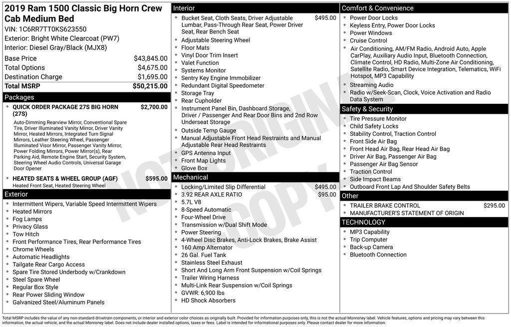Looking for a capable and well-equipped pickup that can handle your toughest tasks? Look no further than this 2019 Ram 1500 Classic Big Horn. With its powerful HEMI 5.7L V8 engine, 4-wheel drive, and impressive towing and hauling capabilities, this truck is ready to take on any challenge you throw its way.Highlighted features include:• Quick Order Package 27S Big Horn• Heated Seats & Wheel Group• Anti-Spin Differential Rear Axle• Trailer Brake Control• 8.4 Touchscreen Display with Apple CarPlay and Android Auto• Heated Front Seats• Leather-Wrapped Steering Wheel• Remote Start System• Dual-Zone Automatic Climate Control• ParkSense Front and Rear Park Assist System• Power-Folding Mirrors• Rear Power Sliding Window• LED Bed LightingThis Big Horn model also comes equipped with a host of advanced safety and convenience features, including Blind Spot Monitoring, Rear Cross-Traffic Alert, and a Rearview Camera, ensuring a confident and comfortable driving experience. Whether you're hauling heavy loads, towing a trailer, or simply commuting in style, this Ram 1500 Classic has the capability and versatility to handle it all.With its striking white exterior and well-appointed interior, this 2019 Ram 1500 Classic Big Horn is not only a workhorse but also a head-turner. Imagine the looks you'll get as you command the road in this impressive and capable pickup.Don't miss your chance to make this Ram 1500 Classic your own. Schedule a test drive today and experience the power, comfort, and convenience that this truck has to offer. Our team of knowledgeable sales professionals is here to answer any questions you may have and help you find the perfect vehicle to fit your needs.*OUR PRE-OWNED VEHICLES ARE FULLY RECONDITIONED. CALL TO SEE WHAT WORK WAS DONE TO THIS VEHICLE** *PROUDLY SERVING THE BRAINERD, GRAND RAPIDS, DULUTH AND SURROUND AREAS!*