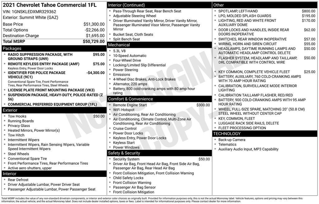 - Identifier for Police Package Vehicle includes, (K47) heavy-duty air filter, (KX4) 250 amp high output alternator, (K6K) 760 cold-cranking amps auxiliary battery, electrical power & vehicle signals for customer connection located at the center front floor. Auxiliary battery circuit for customer connection located in the rear cargo area, (Z56) heavy-duty, police-rated suspension, (XCS) 275/55R20SL all-season tires, (RAV) P275/55R20 all-season spare tire, Police brakes, (RC1) front skid plate, (PXT) 20" steel wheels, Certified speedometer, SEO (5J3) Surveillance Mode interior lighting calibration, SEO (UT7) blunt cut cargo area and blunt cut console area ground wires,(V53) delete luggage rack side rails, (ATD) third row seat delete, (NP0) active single-speed transfer case (4WD only).
